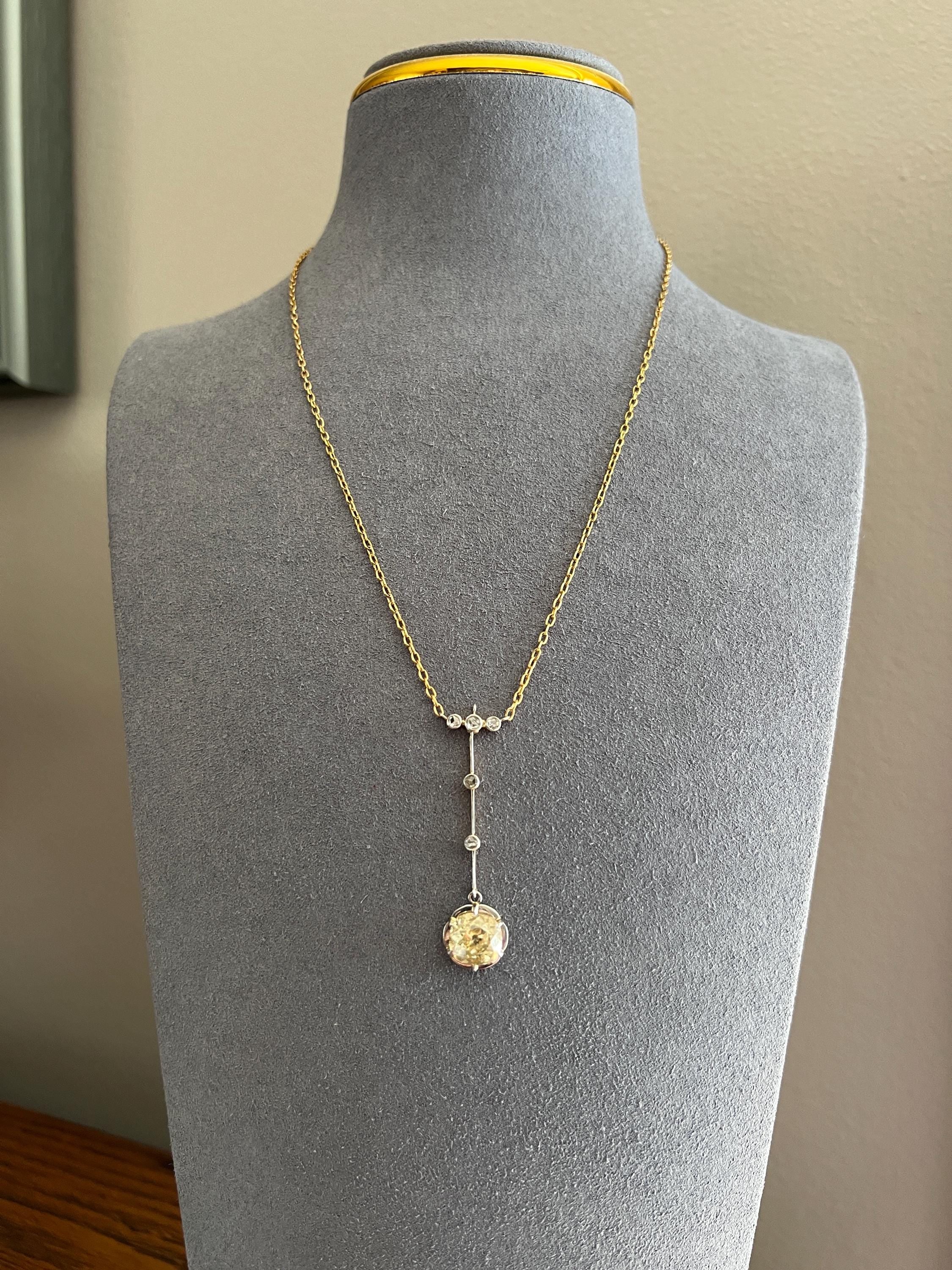 Antique 2.5 Carat Yellow Old Mine Cut DIAMOND Solitaire Pendant Rose Cut Accents on 18k Gold Chain French Necklace