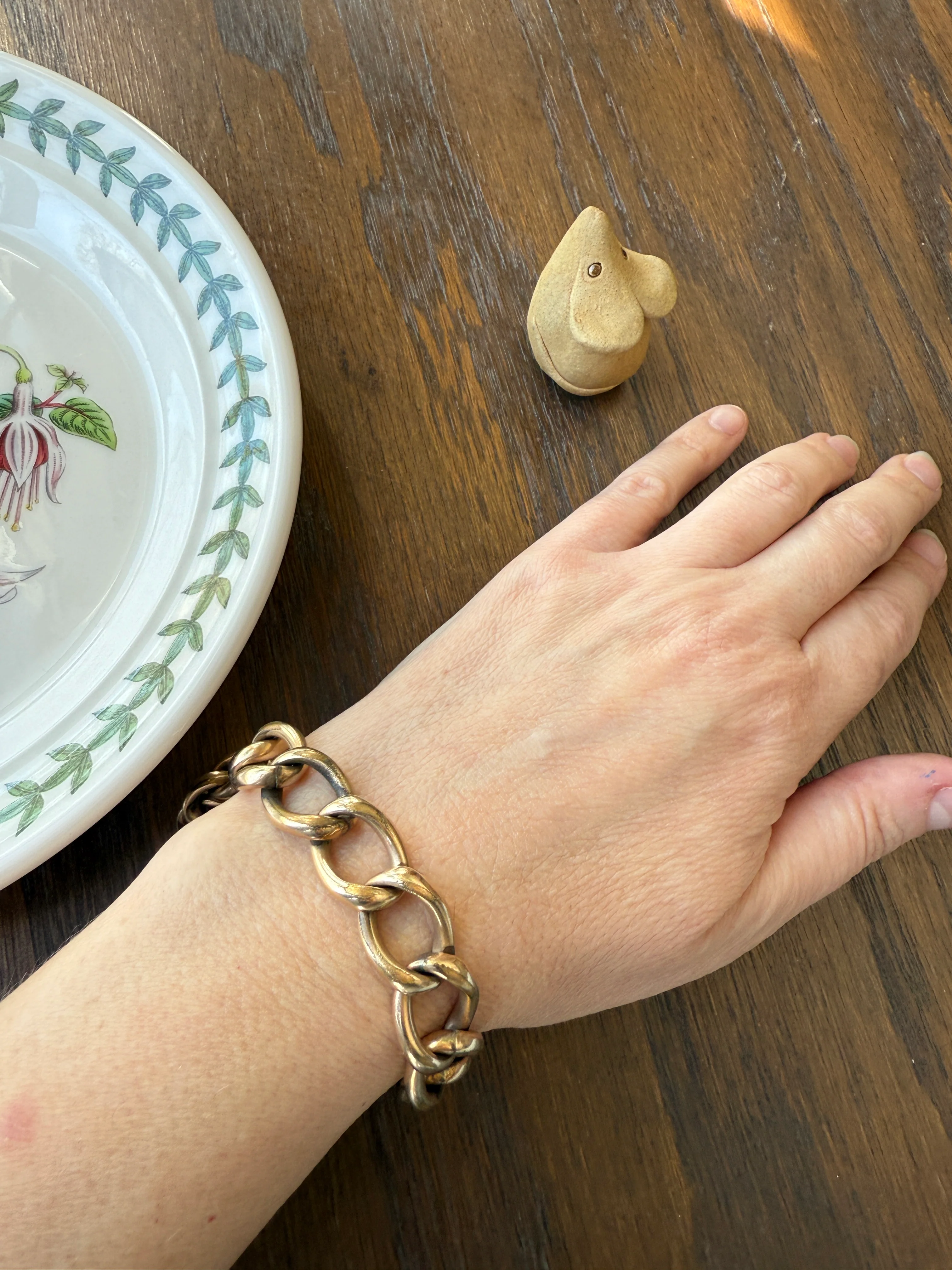 Chunky, heavy oval curb link chain bracelet. Â This one has wear down to the underlying brass due to the way the links rub together. Â It is still sturdy and very wearable but the links have some marks and discoloration where you can see the wear to the layers. Â Seems to fit smaller due to the size of the links, as I have a 5.5 inch wrist and I can't get it on/off without opening it. Â So it actually fits me well in a stack, maybe up to a 6 or 6.5" inch wrist size? Â It has the antique style clasp where the spring ring is ribbed and you use your fingernail on the ribbed end to open. Â It's a little sticky and sometimes you have to help it closed but once shut it remains so, so it is stable to wear.