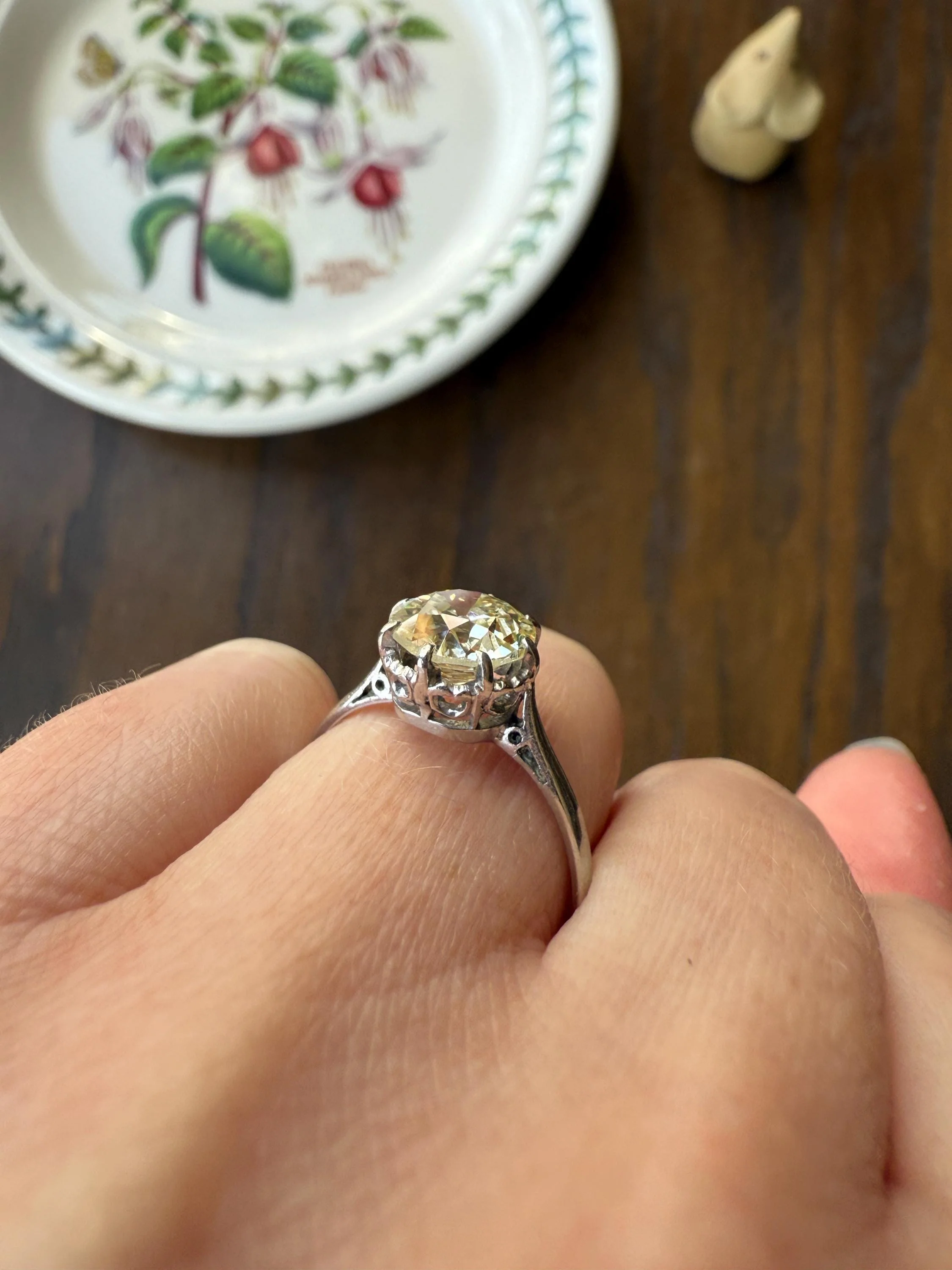 A sparkly and bright little ray of subtle sunshine - as the reads with a touch of yellow in ambient light and then lights up brighter in direct sun. I love antique diamonds like these and they are appropriate for the period as well, have been cut during a period when the mines produced warm rough stones.