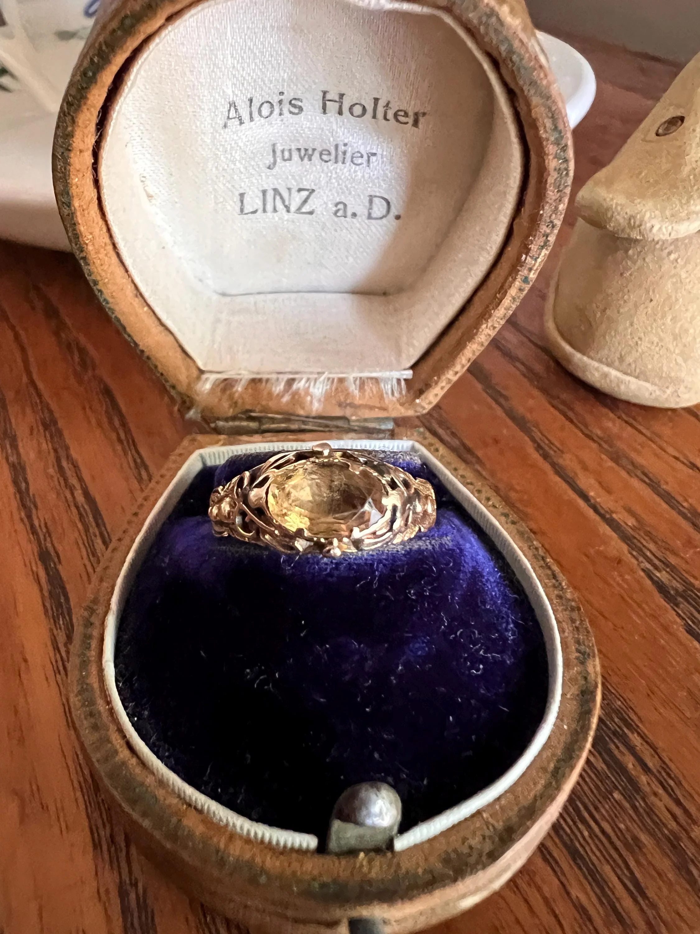 I love antique topaz and this one has such a beautiful setting with scroll work all the way around highlighting the east west oval set topaz. Set in a closed and foil backed setting as is customary for the Georgian period, the stone has a gorgeous glow from within, with rich yellow golden hues and a slight peachy hue under lit magnification. I love that you can see the long open culet under magnification, letting us know the old cut stone is original to the piece.