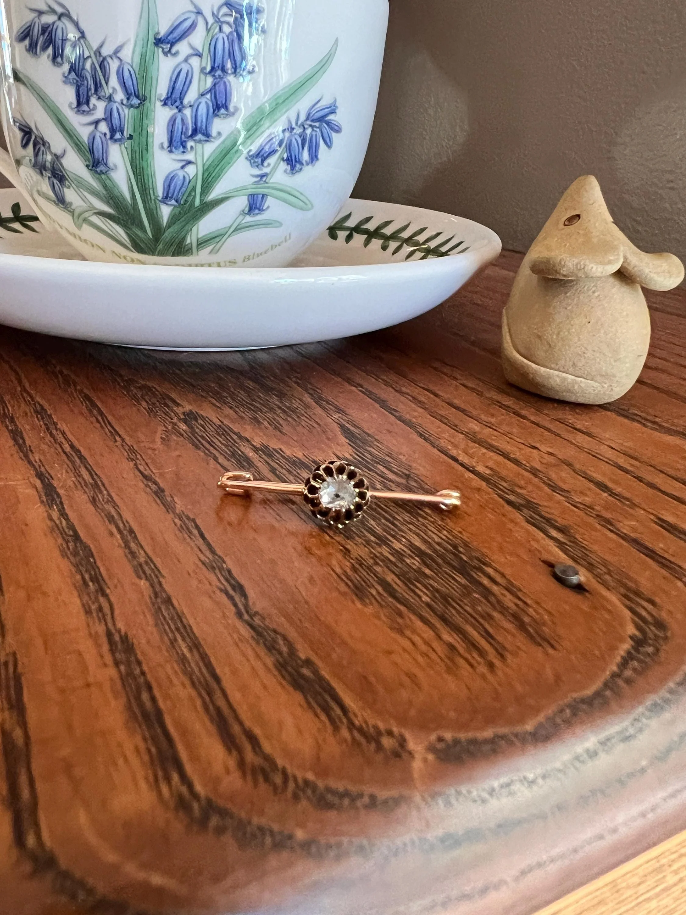 An antique buttercup rose cut diamond set safety pin. The top of the pin has the sweet buttercup setting holding the diamond in a closed back and foiled setting. The piece is crafted in 14k gold.