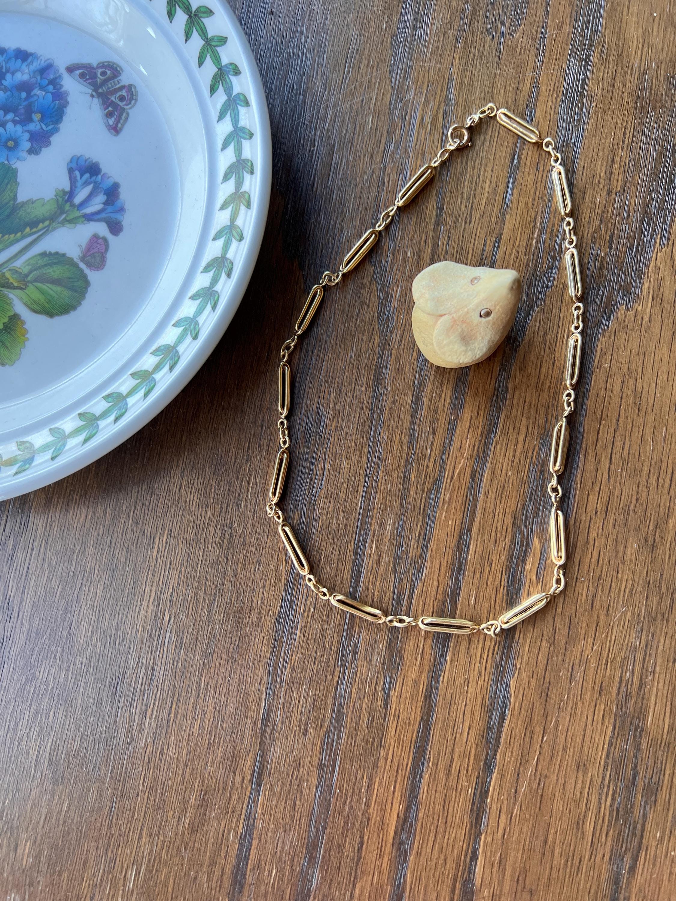 Beautiful French antique necklace in 18k yellow gold. This one has oval tube like links that are crossed to make a 3D link. Shorter length, may have been a watch chain. Substantial enough to wear alone but also interesting geometry to layer with the shorter length. Really beautiful buttery patina and chunky design.