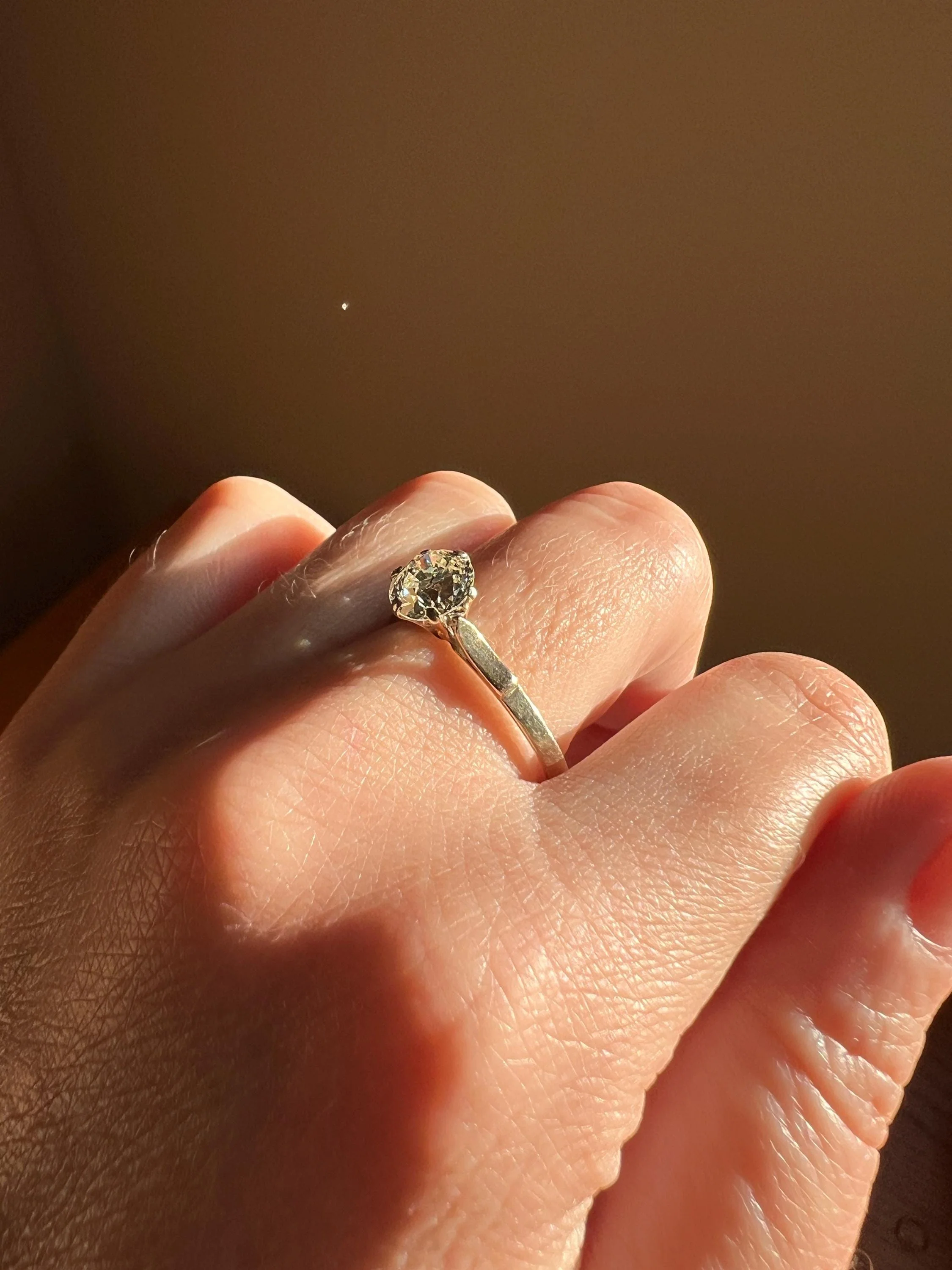 I don't prefer to grade my antique diamonds with the Four C's grading scale which came about way later for machine cut diamonds with mathematically perfected facets. The scale does not do antique stones justice as they were expertly hand cut to their best advantage, in a much more limited supply compared to the millions of carats of machine cut diamonds made each year now. Their uniqueness and quirks are expected and part of their charm, but this one is eye clean. It does have a slight warmth in color in some light, often sought after. This is because most of the rough diamonds at that time came from mines that produced warmer-colored stones.