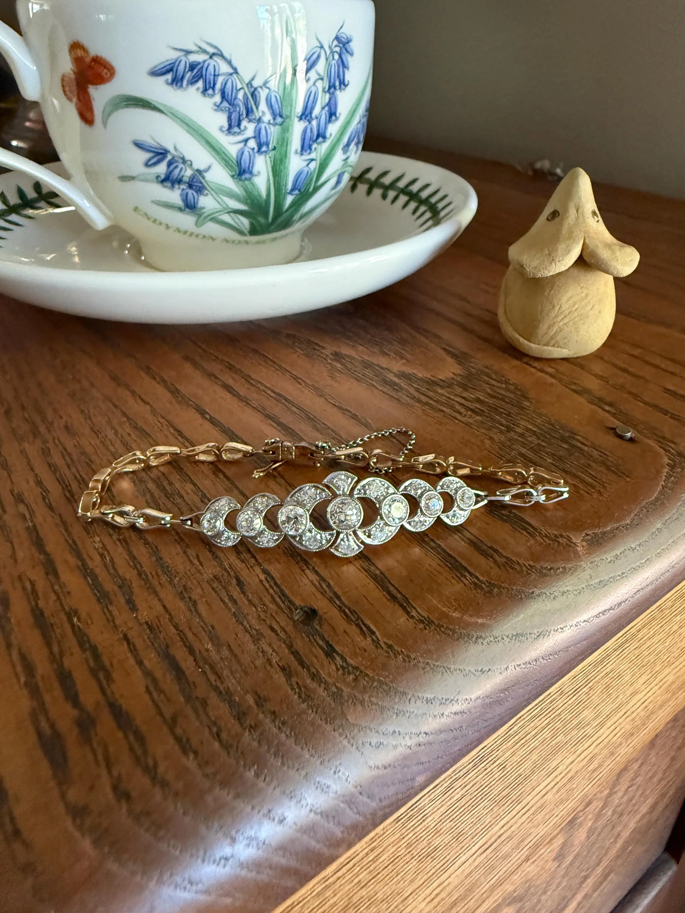So bright and sparkly! I got this ornate beauty on my recent inventory trip to Sweden. This is a nice one to dress up or down as it has some ornateness with the scalloped face but also has a versatile figure 8 chain link around the back so it isn't over the top. It has about 2 1/4 carats of old cut stones - old mine and European cuts for the larger stones, and old single cut stones for the smaller accent stones in the scalloped designs. Beautiful milgrain details around each bezel and around the outline of the piece. Openwork design between the half moon shaped diamond settings allows light to pass through for wonderful sparkle.
