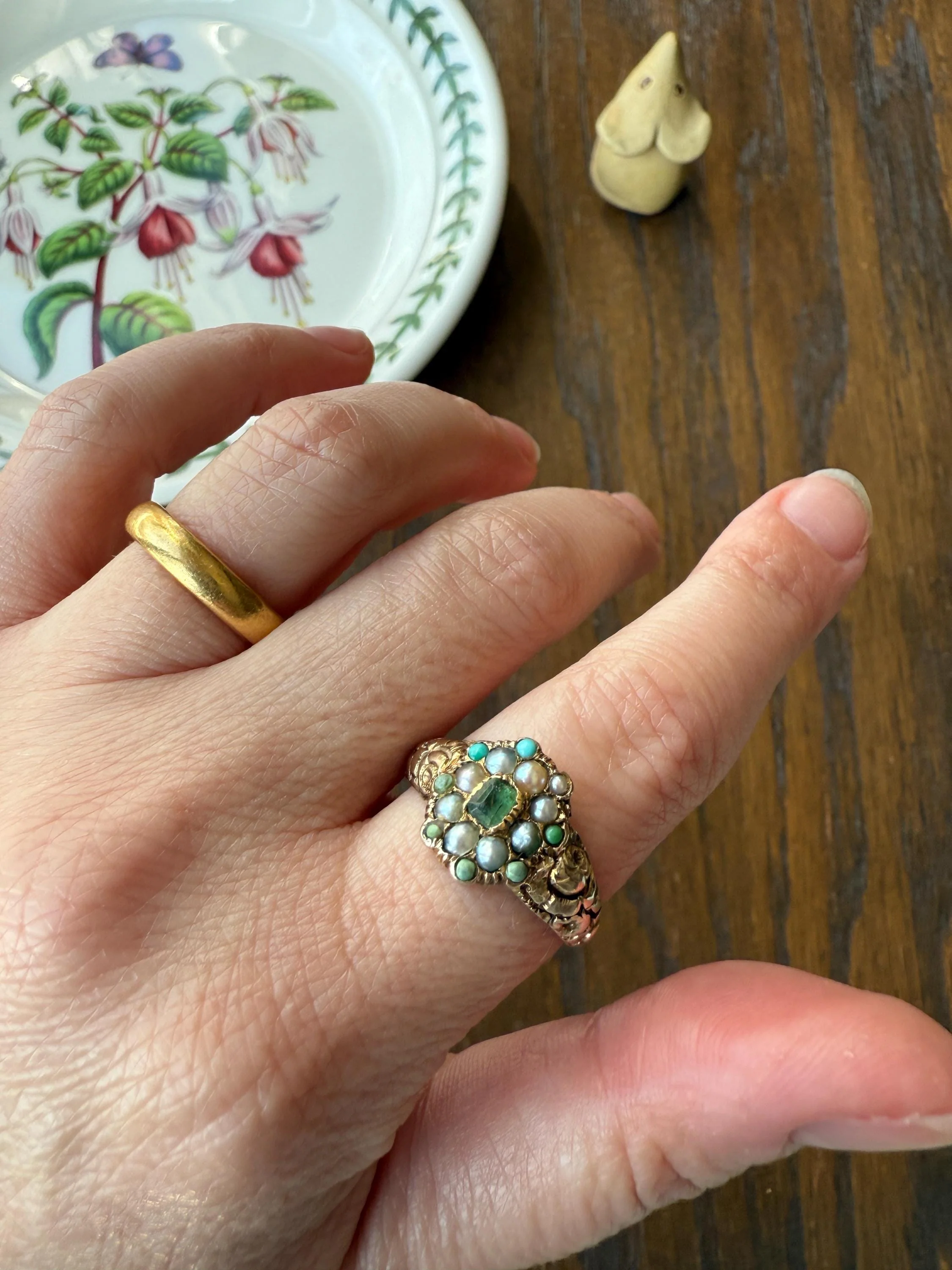 This one is over 200 years old and has signs of age and wear. I kind of like the organic mix of colors on the ring face but some of the pearls and turquoise are replacement (and some appear to be beads as they have more vibrant hues). There is one pearl in the outermost halo that is for sure a replacement because the rest of the halo is tiny turquoise and then some of the turquoise appear more blue while others are more patina'd green from age. There is adhesive residue around some of the stones, most notably the turquoise under magnification, but these were always fabricated with jeweler's adhesive / cement even back in the day. The ring face is stable now and I've not had any problems with it but not recommended for 24/7 wear and getting wet with all the little stones.