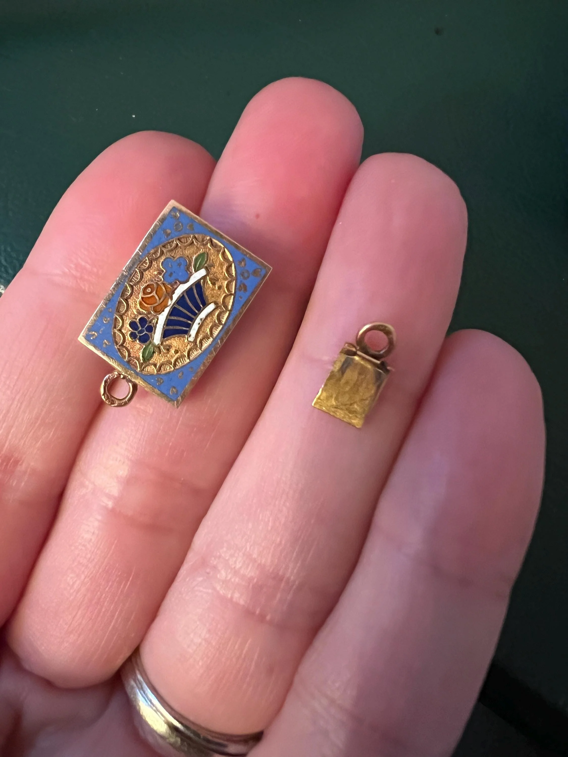 Some nicks and surface wear to the enamel but no loss to the underlying gold so the design is all complete, filled in with color where it should be, it is still very legible. The piece is in good working condition with the clasp tight and secure making a nice click. Uniform surface wear from age but fantastic to wear. Scarce and interesting piece in solid gold. Note the small loops which each held a chain - they are too small to run a chain through so the buyer would have to incorporate some jump rings or a bale that opens to connect to the piece.
