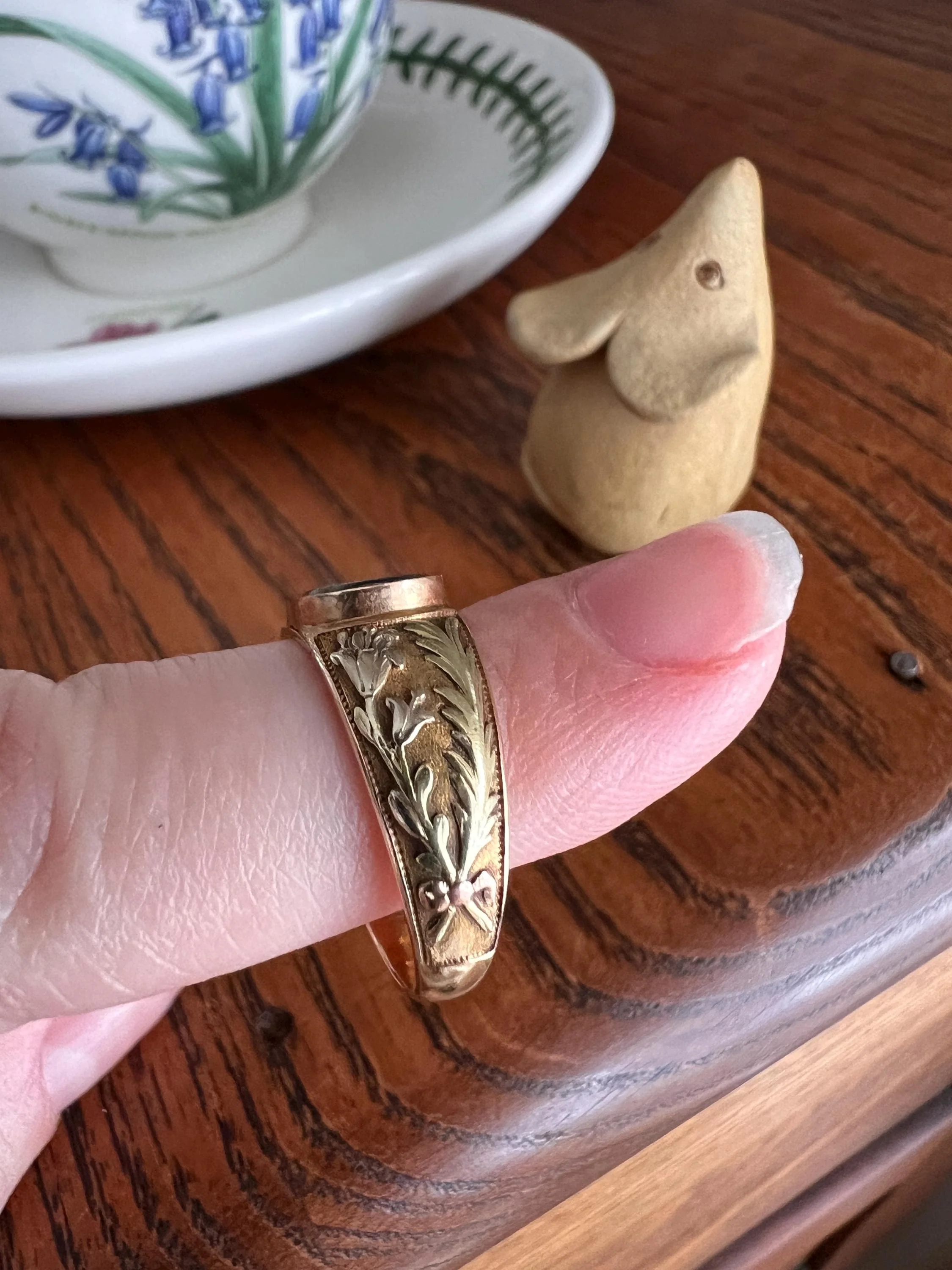 This locket ring is crafted in 18k tricolor gold and dates to the early 1800s. It belonged to the family of a Marquise (the level of French nobility below Duke but higher than Earl, Viscount or Baron) who had very close ties to the royal family, King Louis XV and King Louis XVI. According to family legend, the locket ring was worn by a lady in waiting and originally held a piece of Louis XVI last shirt (sadly lost, the ring was empty when I received it). Louis XVI being the last king of France before the fall of the monarchy during the French Revolution.