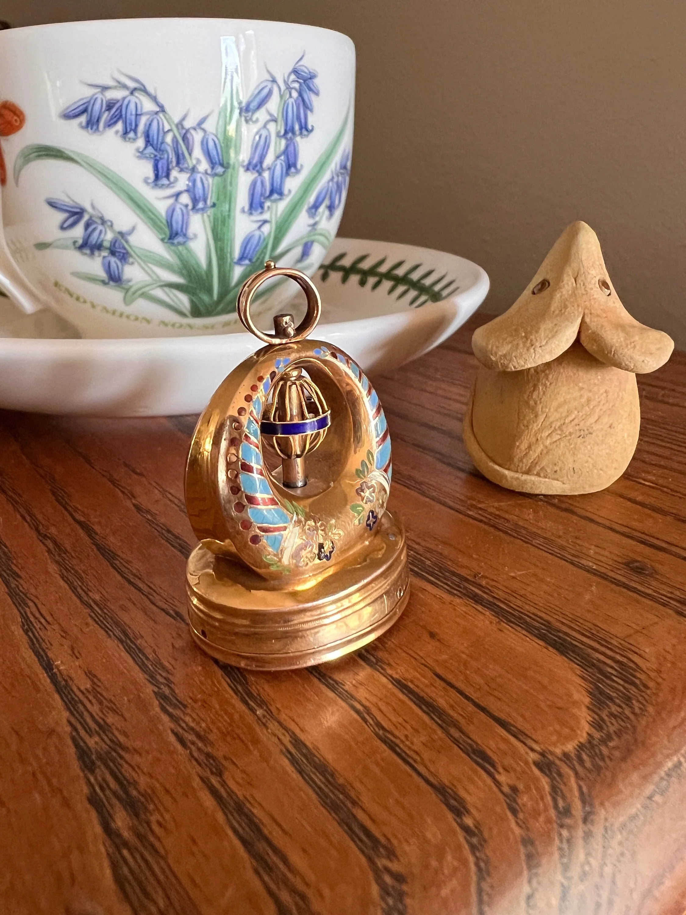 The exterior is beautifully decorated and crafted in 18k gold with enamel in robin's egg blue, cobalt blue, black, red, green and white enamel. Each side has different coloring. At the center is a little bird cage looking ball with enamel strip that spin and moves freely (it is not part of the winding as it winds from the top)