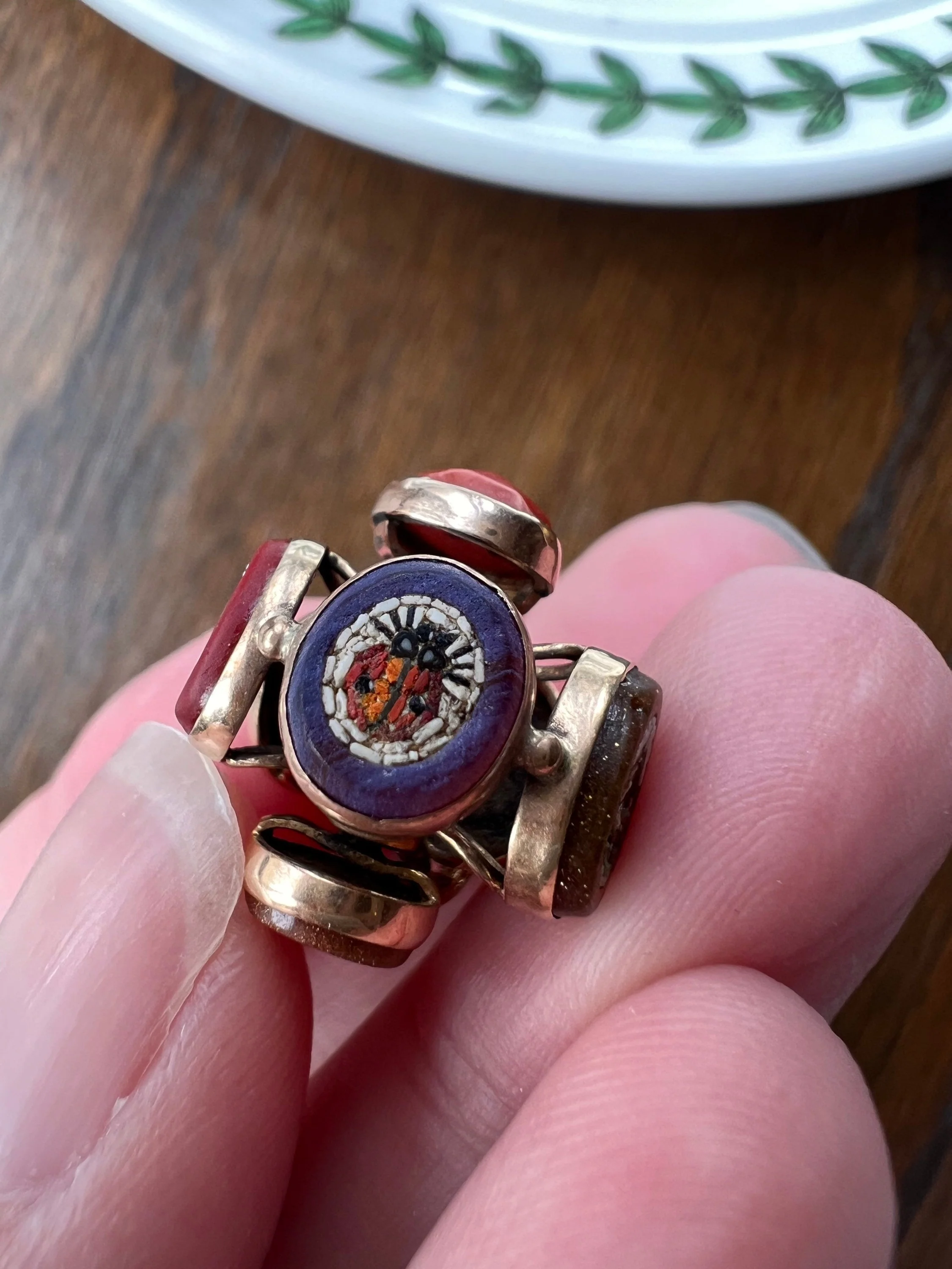 Rare and wonderful multi-stone micro mosaic spinner fob with double coiled snake setting. This moveable and whimsical delight is set with five micro mosaic panels on a spinning wheel with an additional two settings, one on each side. Each panel depicts a different image in tiny micromosaic tiles - a ladybug, a fly, a moth, a bouquet of flowers, and a sailboat. All different designs and colors each set into a different color background stone including goldstone / sunstone, and background colors of green, red, purple and blue.