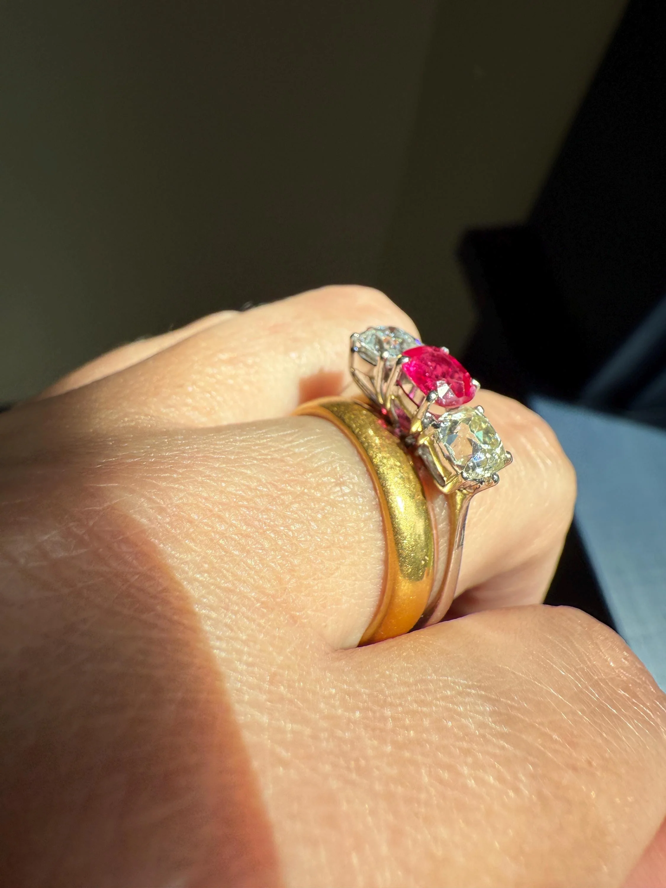 Some abrasions to the table facets of the ruby that can catch the light but the table itself has a nice sheen and polish and the stone really glows from within. The pale yellow diamond is glorious - eye clean with the sought after color from the period. The white diamond is interesting in cut and both have exceptional fire. The white diamond has a small smattering of carbon spots but the stone was cut to help hide them so we really see it more under magnification when viewing the stone from the side.