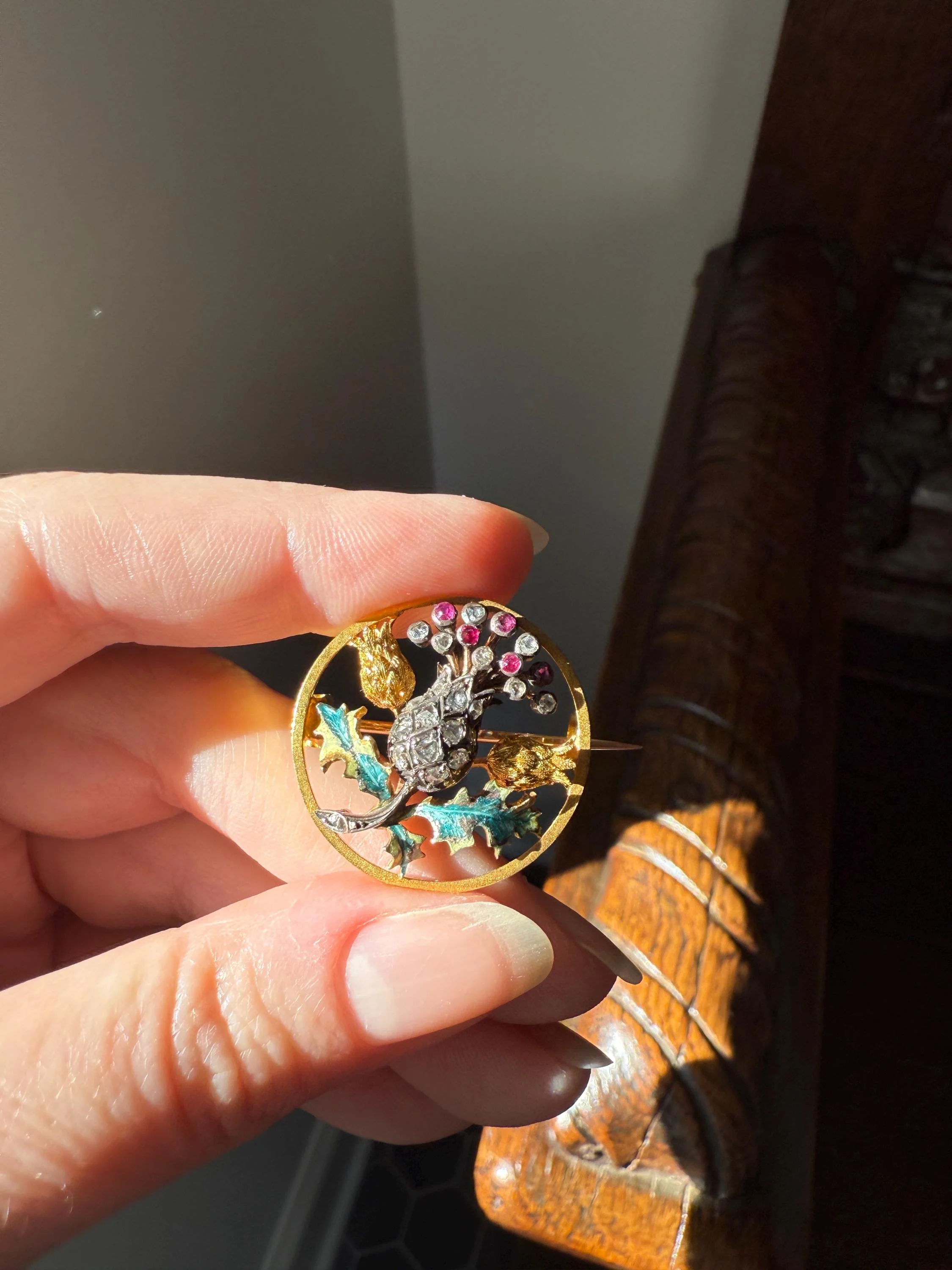 This French antique that I purchased in Paris is so fabulous in its coloring and it has such awesome three-dimensional depth! It's crafted in rich antique 18k gold with three thistle heads. The largest center one is topped in silver for contrast and then has the leaves accented in greenish blue enamel. The bottom of the thistle flower is encrusted with rose cut diamonds and the top "fluffy part" is set with pinkish purple rubies and additional rose cut diamonds for sparkle and color.