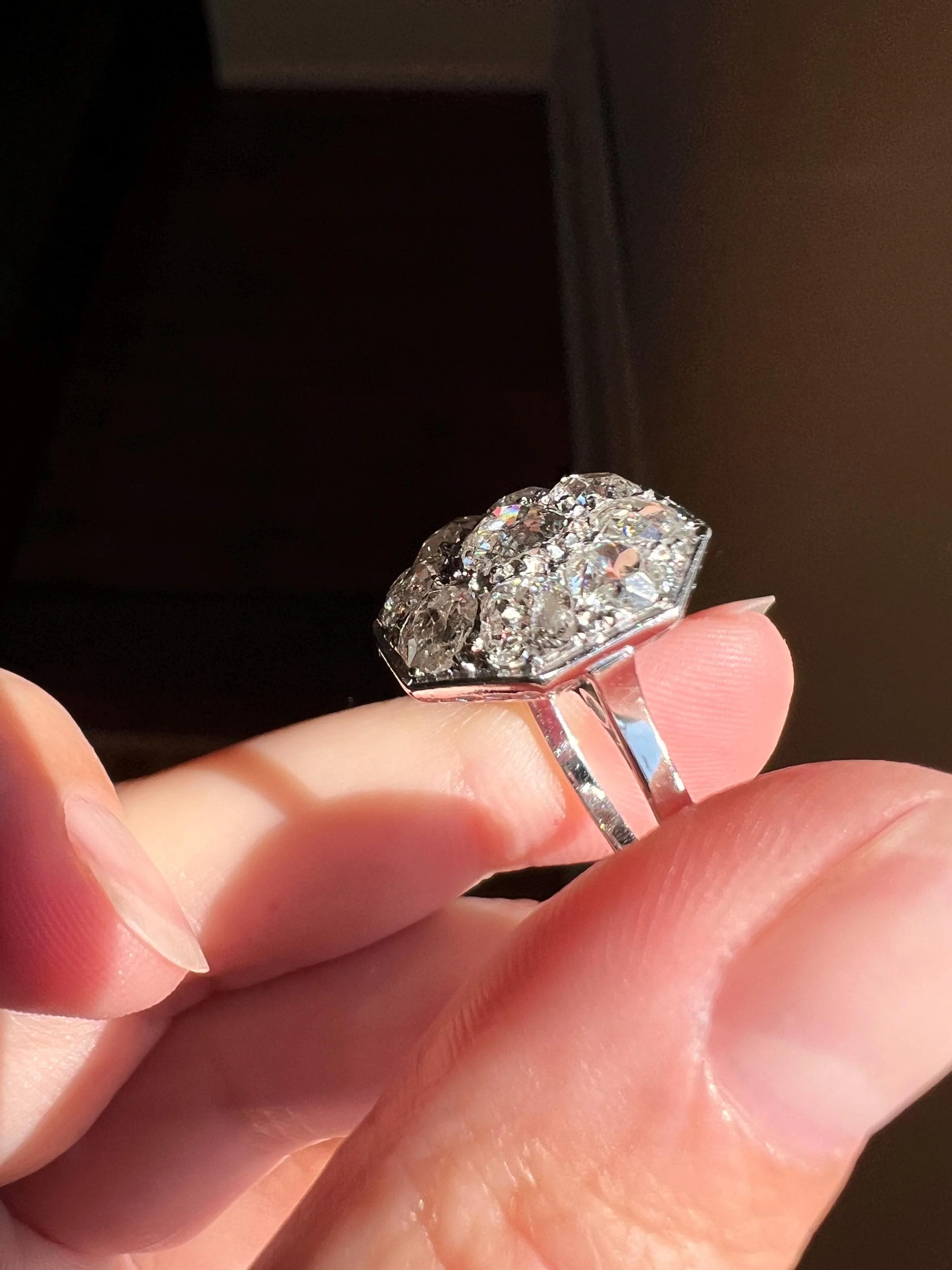 I've had one other octagon ring with smaller total carat weight that I sold for several thousand more than I am offering this one, taking into account the inclusions to the diamonds, so please take note of those inclusions as I am selling it as is, priced with these things in mind. Still an impactful and fun to wear piece. But this is not the ring for collectors who like their antique diamonds bright white and crystal clear.